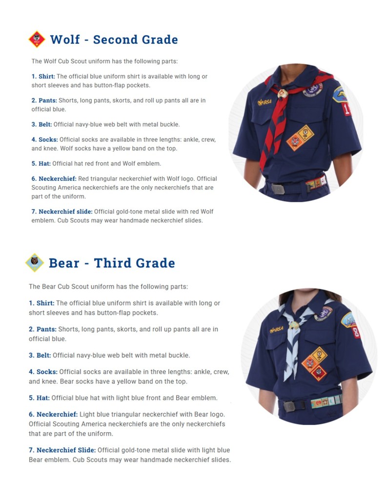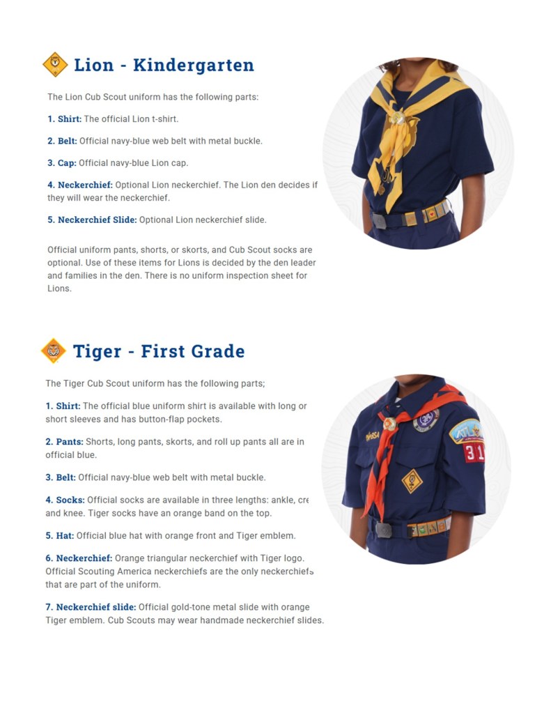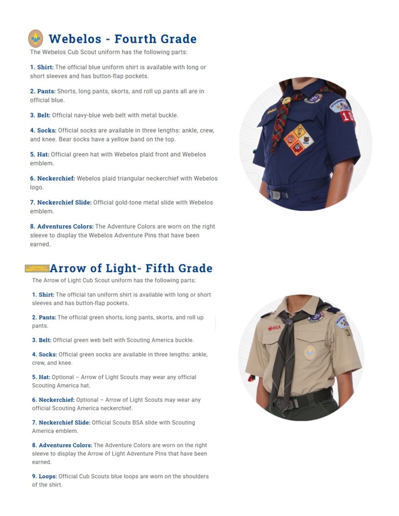 Pack 138 requires the uniform top, belt, and neckerchief only. We do not require the scout issued pants. Any blue pants may be worn with uniforms for K-4th grade. Any green pants may be worn with uniforms for 5th grade.